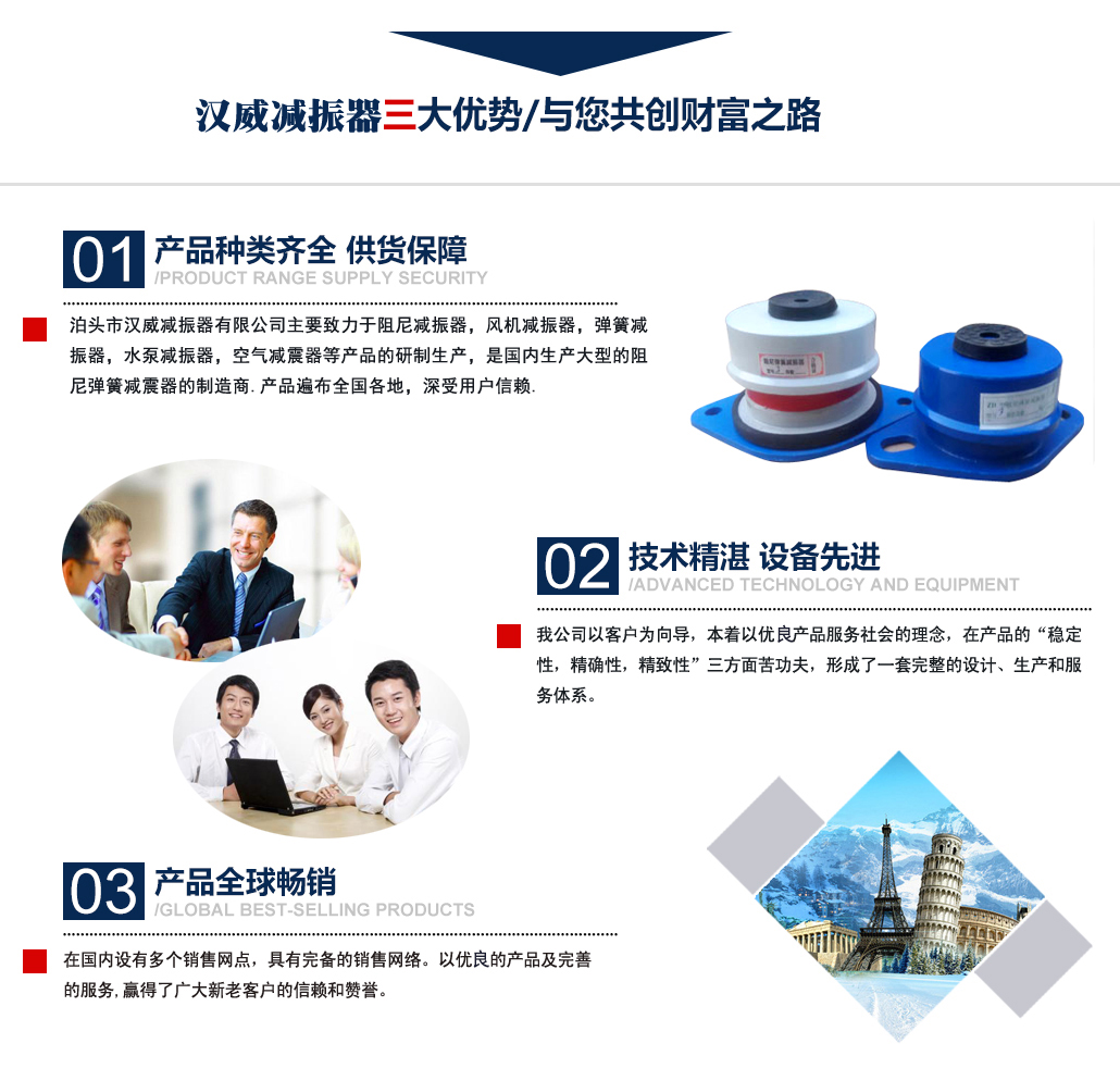 ?泊頭市漢威減振器有限公司主要致力于阻尼減振器,風(fēng)機減振器,彈簧減振器,水泵減振器,空氣減震器等產(chǎn)品的研制生產(chǎn),是國內(nèi)生產(chǎn)阻尼彈簧減震器的制造商,產(chǎn)品廣泛用于中央空調(diào)、通風(fēng)管道、鋼鐵、發(fā)電、石化、水泥和城市供熱等行業(yè)的各類管道和設(shè)備上,并在全國多地工程上得到應(yīng)用,業(yè)績遍布全國多地,深受用戶信賴. 公司主要減振器系列產(chǎn)品有:中央空調(diào)系列減振器、泵房系列減振器、管道系列減振器、風(fēng)機系列減振器、以及自行設(shè)計制作的系列隔振臺座。泊頭市漢威減震器科技有限公司擁有多名高素質(zhì)技術(shù)人員,擁有完善的阻尼彈簧減震器生產(chǎn)和檢驗專用設(shè)備,擁有硅橡膠自動擠出生產(chǎn)線,全自動彈簧機等設(shè)備。生產(chǎn)條件逐漸完善進(jìn)步,努力擴(kuò)大生產(chǎn)規(guī)模,提高泊頭市減震器科技有限公司的生產(chǎn)競爭力。 多年來漢威減振器以三誠作為公司的字號,旨在立足當(dāng)前......
